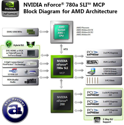 On the chipset itself, the NVIDIA 780a MCP is paired with the nForce 200 Southbridge featuring 35 PCI Express lanes and 7 links. NVIDIA's MediaShield supports RAID 0, 1, 0+1, 5, or JBOD over its SATA2 ports. PCIe 2.0 and NVIDIA's ESA is also introduced with this chipset.