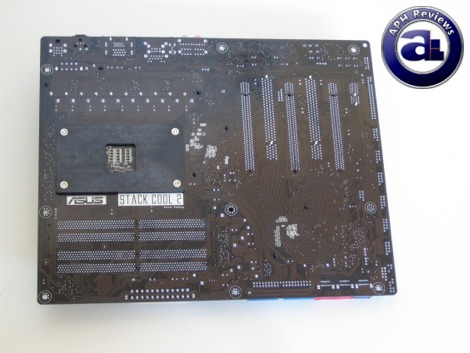 A shot at the back of the motherboard. With Asus' Stack Cool 2, where a layer of metal is integrated into the motherboard to spread heat generated by components around more evenly. Through this, it lowers the amount of concentrated heat spots in one area but instead distributes it over a larger surface area for better heat dissipation.