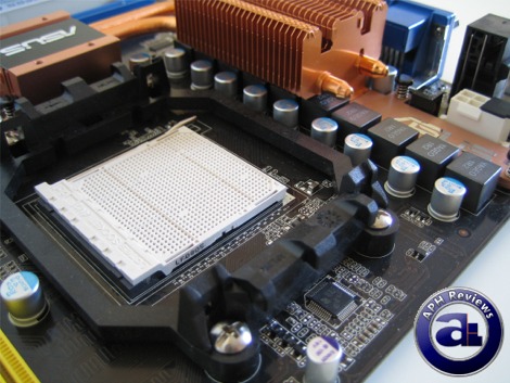 The standard AMD retention bracket surrounds the 940-pin socket for AM2 CPUs. Heatpipes run around the CPU socket in reasonable proximity and height; along with capacitors and voltage regulators that should not have any problems in terms of compatibility with aftermarket CPU coolers. Along the left of the AM2 socket are ten voltage regulators in a row -- for what Asus calls the "8+2 phase power design". The idea behind it is that it has an 8-phase power regulation for the CPU and 2 additional ones for the integrated memory controller on AMD processors.