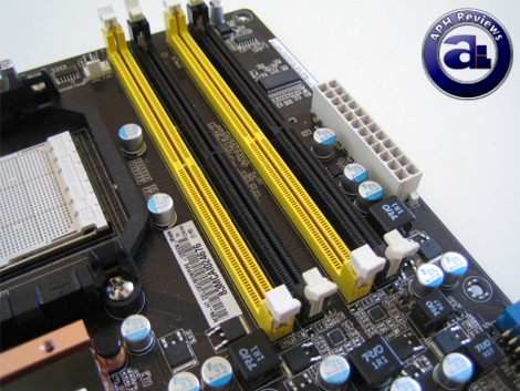Asus M3N-HT Deluxe's memory sockets are placed fairly close to the CPU socket -- so large coolers may have clearance issues with memory that utilizes tall heatsinks. On the positive side, the memory sockets are placed high and near the top of the board for a large clearing between the bottom clips and the main PCI Express slot. I can see this from a design perspective that the M3N-HT Deluxe doesn't incorporate fancy multiphase power designs like other Asus high end boards, therefore this implementation is possible -- but hey, most AM2 boards are not astoundingly expensive anyways -- so we don't expect a lot of high end features at this point anyways.