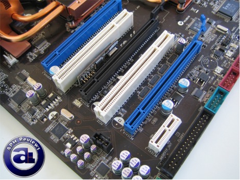 Between the first PCI slot and the second PEG slot is the flash memory chip used to store Asus' Express Gate onboard Linux OS.