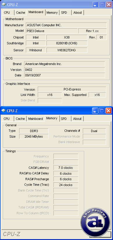 CPU-Z screenshot of the motherboard and RAM tab. RAM used is the OCZ Platinum PC3-12800 Enhanced Bandwidth Edition 2x1GB DDR3 RAM, running at stock speeds and non-stock timings. BIOS version 0402 is used with the P5E3-Deluxe for our benchmarks; in which is the latest stable non-beta release at the time of writing.