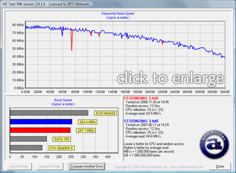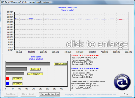 HD Tach will test the sequential read, random access and interface burst speeds of your attached storage device (hard drive, flash drive, removable drive, etc). All drive technologies such as SCSI, IDE/ATA, 1394, USB, SATA and RAID are supported. Test results from HD Tach can be used to confirm manufacturer specs, analyze your system for proper performance, and compare your performance with others. HD Tach is very easy to use, quick, and presents data in easy to read graphs, including the ability to compare two storage devices on screen at the same time for easy analysis.