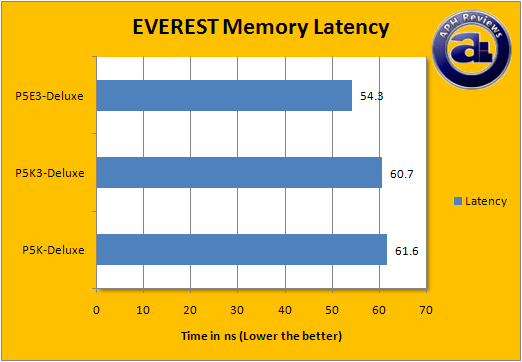 Again, we can see effects from Intel X38's improved memory controller performance on the Asus P5E3-Deluxe. Even in the latency category, we can see that P5E3-Deluxe put out 54.3ns on paper, while the P5K-Deluxe and P5K3-Deluxe has a score of 61.6ns and 60.7ns, respectively.