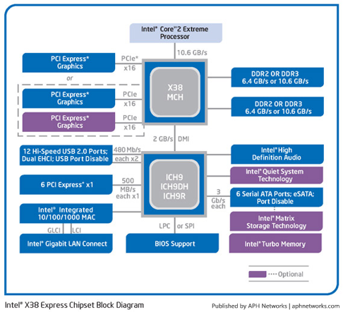 The chipset diagram of Intel's X38 chipset, as obtained from Intel's website. With offering native support for 1333/1066/800MHz system bus, Asus claims to offer support for 1600MHz QDR FSB processors out of the box as well. As with all current generation Intel chipsets, it will support 45nm Penryn by default.