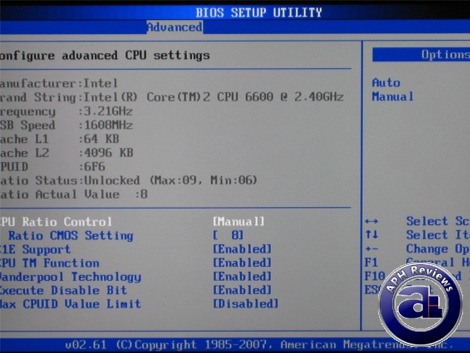 Additionally, certain CPU features can be controlled in the dedicated CPU configuration page. It's quite interesting because you can set CPU multiplier in two locations: One in the overclocking page; the second one being on the CPU advanced settings page. There's no literal SpeedStep/EIST configuration at this point, but you can disable or enable C1E Support -- which will show the SpeedStep option once C1E is enabled and rebooted.