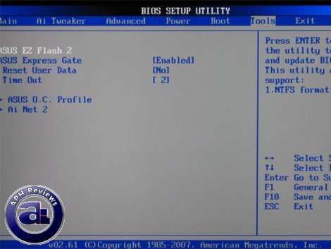 In the Tools tab, standard options such as Asus EZ Flash 2, Asus OC Profile, and Ai Net 2 can be found. In addition to that, configuration for Asus' Express Gate onboard Linux based OS can be set to enabled or disabled; along with timeout during bootup. Data clearing/reset for Express Gate can also be done on this screen.