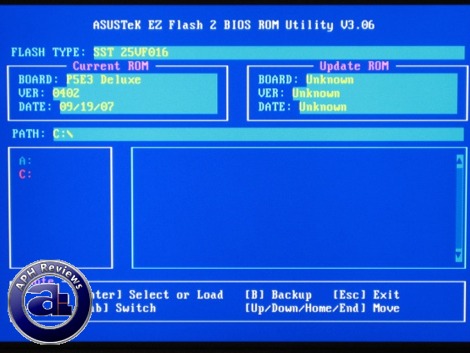 As usual with Asus motherboards, the Asus P5E3-Deluxe features Asus' EZ Flash BIOS update utility. This allows flashing without a floppy or the problems of Windows utility flashing. I experienced no problems updating with the ROM file stored on a USB flash drive.