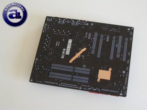 A shot at the back of the motherboard. With Asus' Stack Cool 2, where a layer of metal is integrated into the motherboard to spread heat generated by components around more evenly. Through this, it lowers the amount of concentrated heat spots in one area but instead distributes it over a larger surface area for better heat dissipation.