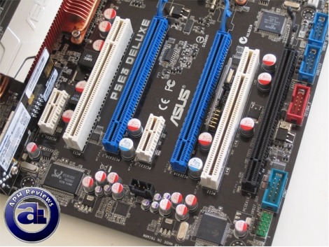 A series of relatively low profile capacitors and components constituting Asus P5E3-Deluxe's 8-phase power design reside fairly close to the CPU socket, but generally I haven't had any problems regarding clearing with any heatsinks I've tried in the past. The surrounding heatpipes are either far enough or low enough to accommodate the large Scythe Infinity heatsink used in our testing, which is great news for all users.