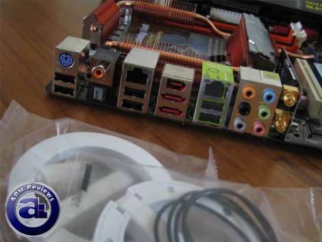 The back I/O section is almost identical to what we've seen with the Asus P5K3-Deluxe and the Asus P5K-Deluxe. One PS/2 port is dropped in favor of two USB ports; in which most people would find much more useful. S/PDIF outputs include the standard optical and coaxial out. Four more USB ports are located on two different blocks with a Gigabit network adapter each. Between the two is a block with two eSATA ports and a Firewire port. Six 3.5mm analog ports come in standard, along with two Wi-Fi antenna connectors for MIMO/Wireless-N capabilities (The board didn't get its 'WiFi@n' part of it's name for nothing!). Two antennas are included out of the box, and we'll discuss the software side of this in just a moment.