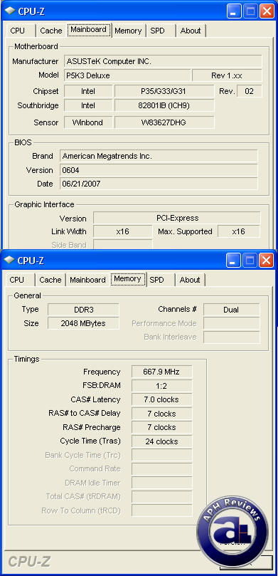 CPU-Z screenshot of the motherboard and RAM tab. RAM used is the OCZ Platinum PC3-12800 Enhanced Bandwidth Edition 2x1GB DDR3 RAM, running at non-stock speeds and timings. BIOS version 0604 is used with the P5K3-Deluxe; in which is the latest stable release at the time of writing.