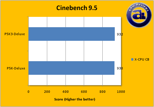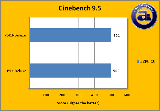 In Cinebench 9.5, we've executed both the single threaded benchmark as well as the multithreaded benchmark. The results are extremely close together -- in which we've had to run the same benchmark multiple times to confirm this result. The test results produced a 1 and 2 point lead for the P5K3-Deluxe, respectively.