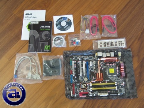Out of the box, you will get the Asus P5K-Deluxe itself. Standard accessories include an I/O shield, standard PATA cable, floppy IDE cable, four SATA cables, two dual SATA power cables, two manuals (One for the motherboard itself, another for Wi-Fi), dual USB and FireWire PCI backplates, as well as an omni-directional antenna for the Wi-Fi feature.