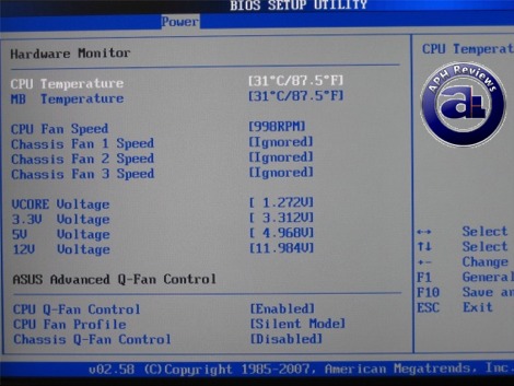 The Hardware Monitor page in the P5K-Deluxe BIOS. For some reason, the P5K-Deluxe with BIOS revision 0311 does not really like low RPM with the CPU fan. For one thing, Asus' Q-Fan Silent mode reduces the fan speed to roughly 1100rpm to 1200rpm on idle only -- not much of a slowdown with my Scythe Infinity. When I put a resistor cable between my Scythe Infinity and the motherboard header, it dips below 1000rpm, but on several occasions the P5K-Deluxe prompted a CPU fan error during bootup.