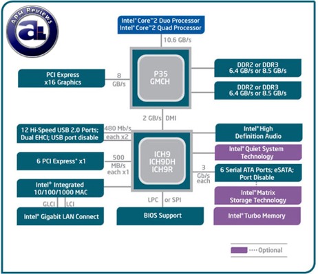 The Intel P35 chipset diagram, as obtained from Intel's website. As far as PCIe lanes go, 16 (MCH) + 6 (ICH) is still far behind NVIDIA's 46 on their flagship 680i. Intel still retains ATI Crossfire support on the P35 at 16-4 configuration. Currently, 22 PCIe lanes should suffice, but the limitation of design comes down to lack of bandwidth to the second PEG slot. Because 16 lanes comes from the northbridge and 4 lanes from the southbridge, it also suffers from the limitation of data transfer/communication between the chipsets.