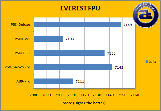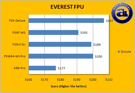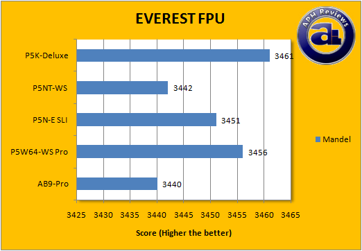 The P5K-Deluxe again led in our EVEREST synthetic benchmark (FPU) - +7 points over the P5W64-WS Pro.