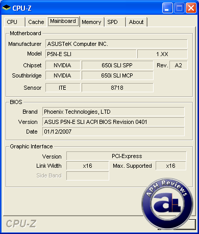 A quick shot at the CPU-Z Motherboard tab. We'll go over information in regards to the chipset and sensor, along with a detailed look at the motherboard itself just shortly: