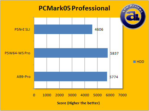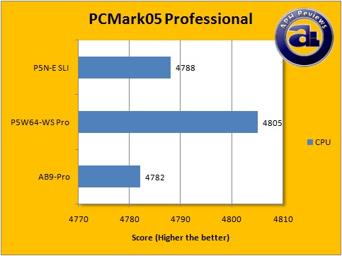 In terms of CPU performance, it seems that the P5N-E SLI has a slight edge over the abit AB9-Pro. The highest scoring was the Asus P5W64-WS Professional motherboard in this category.