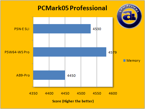 Once again, the P5N-E SLI came in second behind the Asus P5W64-WS Professional; but has a slight edge over the abit AB9-Pro according to PCMark05's memory benchmarks.
