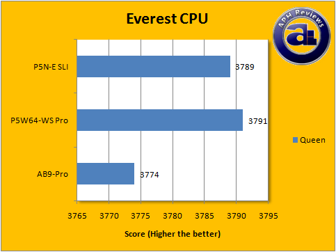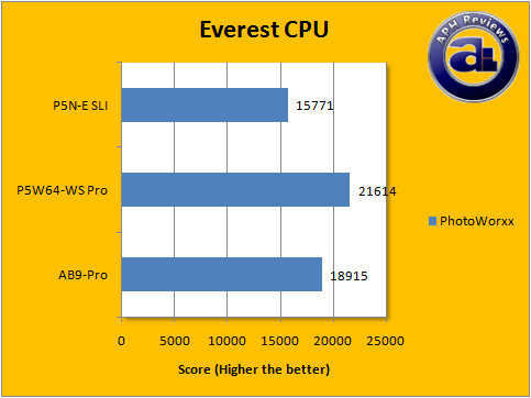 In the EVEREST CPU PhotoWorxx benchmark, the P5N-E SLI surprisingly trailed the top board by nearly 6000 points. The abit AB9-Pro resulted in second place with 18915 points -- roughly 3000 points better than the Asus P5N-E SLI.