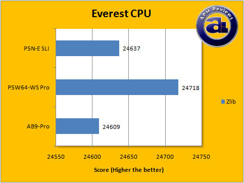 The Asus P5W64-WS Professional came out first again in our EVERST CPU Zlib tests. However, the Asus P5N-E SLI is not too far behind; and led the abit AB9-Pro by approximately 30 points.