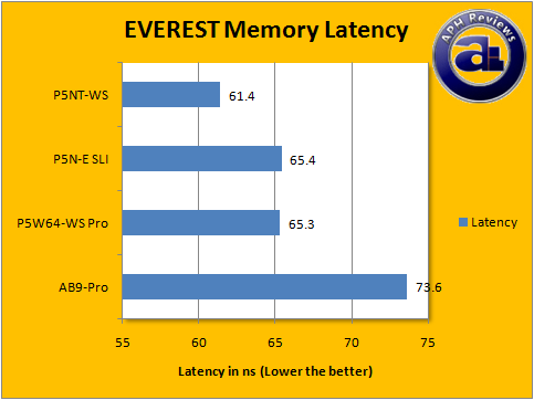 Continuing our EVEREST Memory Benchmark it clearly demonstrates to us that the memory controller on the Asus P5NT-WS motherboard is very good -- leading in the results every time against Intel chipset based motherboards as well as the mainstream Asus P5N-E SLI. The memory latency came in at a result of 61.4ns on our charts.