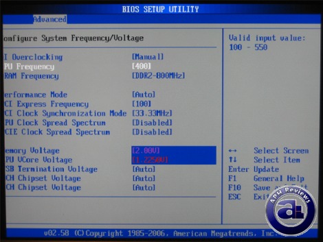 As for voltages, RAM frequency can be adjusted from 1.85V to 2.40V in 0.05V increments. CPU voltage ranges from 1.2250V to 1.7000V at 0.0025V increments (Lots of significant digits here haha). FSB termination voltage can be adjusted from 1.20V to 1.50V at 0.10V increments; MCH chipset voltage from 1.20V to 1.50V at 0.10V increments; while ICH chipset voltage can be set to either 1.05V or 1.20V. DDR2 frequency can be set from DDR2-400 to DDR2-1066 but scalable as you increase FSB. For example, if your RAM runs at DDR2-533 (1:1 with a Core 2 Duo), and you raise the FSB frequency to 400MHz, the RAM will still remain 1:1 with CPU but becomes DDR2-800 automatically.