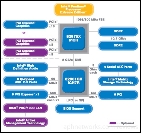 Diagram of Intel's i975X chipset. Since i975X is an older chipset than the company's P965, it utilizes ICH7R instead of ICH8R. ICH7R supports only 4 SATA2 ports natively; whereas ICH8R supports up to 6 SATA ports. The Asus P5W64-WS Professional has a total of 7 internal SATA2 ports -- where an onboard Marvell 88SE6145 controller takes care of the other three. The Intel ICH7R controlled ports has support for Intel Matrix Storage Technology that allows JBOD and RAID 0,1,10,5 configurations. The Marvell 88SE6145 supports JBOD, RAID 0,1,10 (No RAID 5); the single eSATA at the back I/O panel is also controlled by this chip.