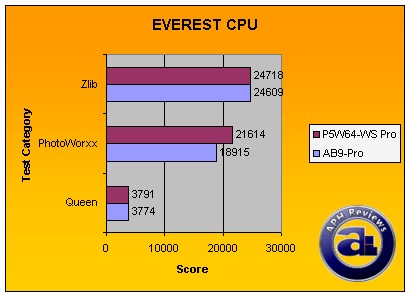 Again, the Intel i975X based Asus P5W64-WS Professional led in all three tests in the EVEREST CPU benchmarks. However, the only one that is significant on our charts is the PhotoWorxx test -- the Asus got a performance advantage by nearly 3,000 points.