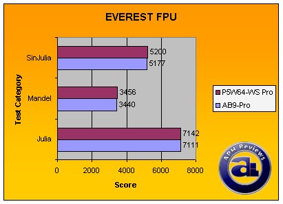 Although a statistical tie, the Asus again led by just those few points on all three tests. The EVEREST FPU tests are quite CPU dependent, and a 7MHz or so faster clock speed is enough to gain extra points due to the fact that our Core 2 Duo E6300 runs at 267MHz FSB on Asus' P5W64-WS Professional and 266MHz on abit's AB9-Pro. The reason we left it at that is because we want to run all our tests on stock speeds without interrupting anything (Whether for higher or lower scores).