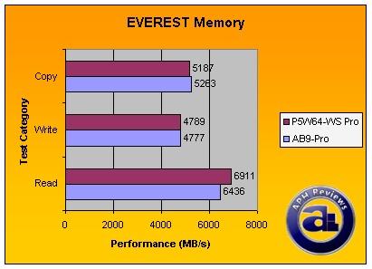 Surprisingly, abit's AB9-Pro had a slight advantage in EVEREST's Memory Copy test, a statistical tie in the write test -- but the Asus P5W64-WS Professional had an approximate 300 point lead in the memory read benchmark.