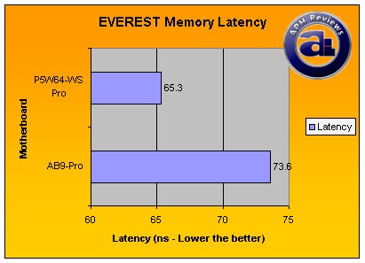 In terms of memory latency, measured in ns (Nanoseconds), generally lower the better. The Asus P5W64-WS Professional has a clear lead of 65.3ns versus AB9-Pro's 73.6ns score. Memory used was OCZ Special Ops Edition Urban Elite PC6400 2x1GB in all our tests running at stock latencies of 4-4-3-15.