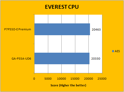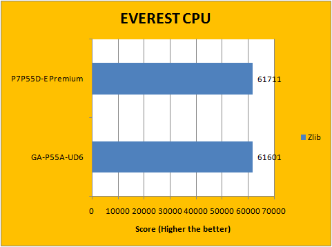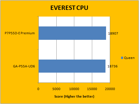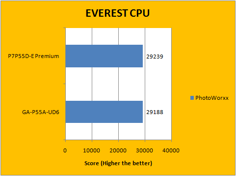 There has always been very little difference in performance between motherboards -- this is especially held true in the case of Intel's new P55 chipset, since the new PCH does a lot less than its predecessors. What it really boils down to is who has slightly more aggressive default motherboard settings. In our case, I plugged everything into manual mode to make it as fair as possible by eliminating as many of these variables as possible. Our results above show that the Asus P7P55D-E Premium and Gigabyte P55A-UD6 to be very close in EVEREST CPU, with the Asus motherboard leading by a slight hair over the Gigabyte in each test.