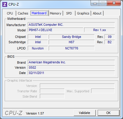 CPU-Z screenshot of the motherboard tab running ASUS P8H67-I Deluxe in Windows 7 Professional x64. At press time, we were using ASUS' 0502 BIOS revision. This is the only BIOS revision at the time of writing this review.