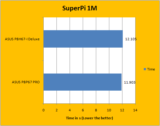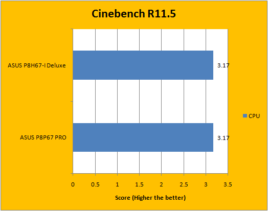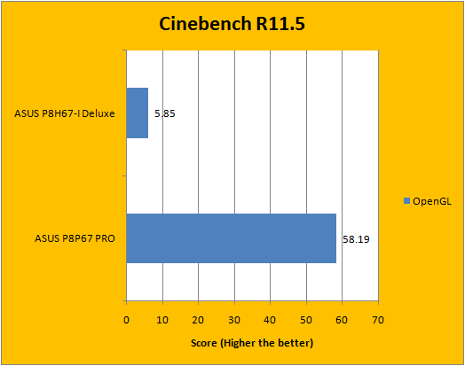 As far as rendering performance is concerned, Cinebench R11.5 is mostly CPU dependent in the CPU tests (As its name suggests). It turned out identical results regardless of RAM and motherboard used, but in the OpenGL benchmark, things came out a little different than before. This is more of a graphics benchmark than a motherboard test, so the big gap you see in between is simply due to the dedicated Radeon graphics card used with the P8P67 PRO.