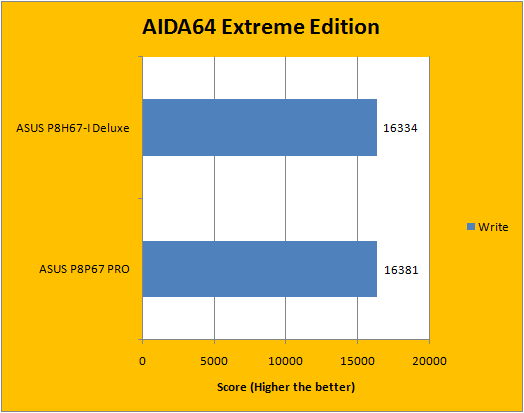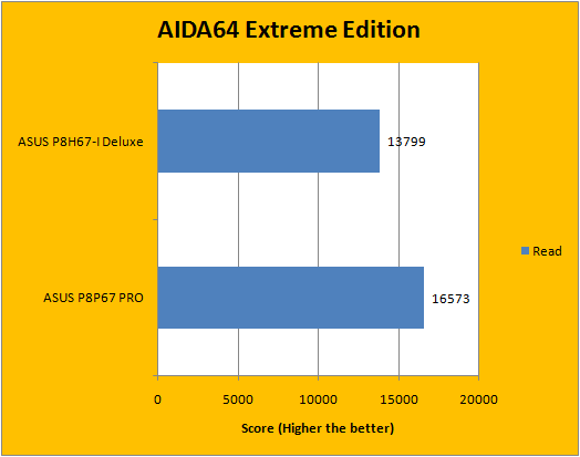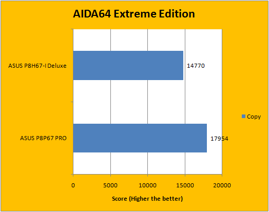 AIDA64's synthetic memory tests is the one next up to produce results for our review today. In pretty much all the benchmarks, we can see that higher memory bandwidth RAM kits are generally favored -- whether it be the Copy, Write, or Read results. One thing to point out is the Latency benchmark of AIDA64 is affected by both bandwidth and timings, so in case two sets of RAM run at the same speed, usually the one with the lower latency wins. Our test results are skewed in favor of the P8P67 PRO simply because it has faster desktop memory installed -- other than that, the P8H67-I Deluxe should exhibit identical performance characteristics.