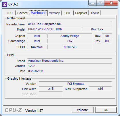 CPU-Z screenshot of the motherboard tab running ASUS P8P67 WS Professional in Windows 7 Professional x64. At press time, we were using ASUS' 1202 BIOS revision. This is the latest BIOS revision at the time of writing this review.