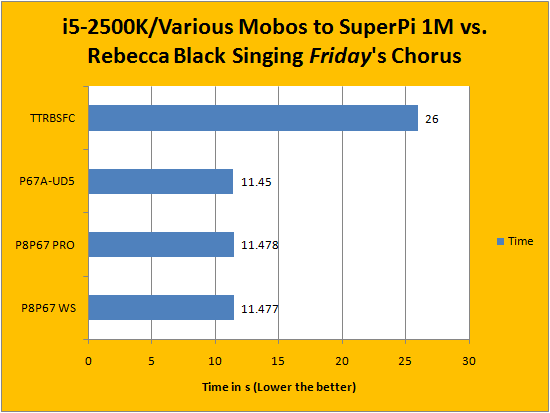 Random fact of the day: By the time she finishes singing all those lines, a standard Intel Core i5-2500K will finish calculating to one million digits of Pi with more than 14 seconds to spare. The other way of putting is, by the time a Core i5-2500K finishes calculating to one million digits of Pi, Rebecca Black would not have even finished half her chorus in 'Friday'. For data visualization purposes, here is an updated benchmark graph, where "TTRBSFC" stands for "Time it Takes for Rebbeca Black to Sing Friday's Chorus".