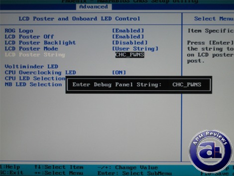 The onboard LEDs and LCD Poster can be configured in the BIOS, as shown above. The LCD Poster can be set to display up to eight characters after your computer has finished initializing. By default, it is to be used as a clock display.