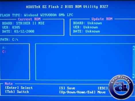 As usual with Asus motherboards, the Asus Striker II NSE features Asus' EZ Flash 2 BIOS update utility. There's issues with updating with BIOS up to 0305 in EZ Flash, so you'll have to use other methods to update at this point.