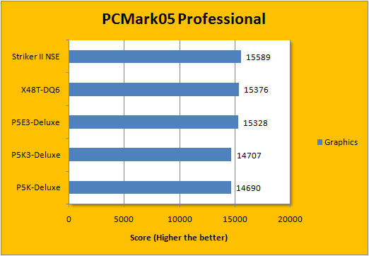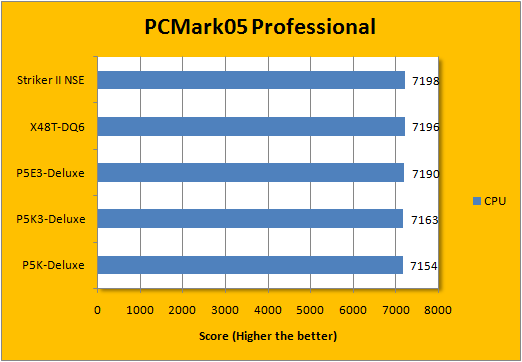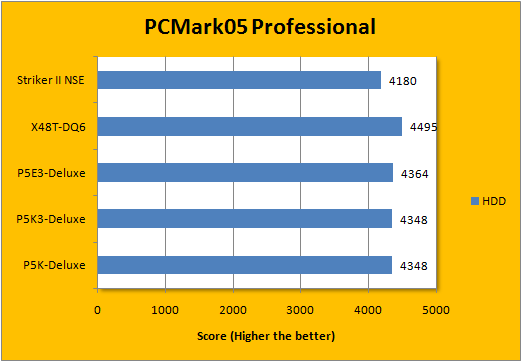 In PCMark05, the Striker II NSE performed the best by a couple points in the CPU and graphics tests; while posting quite a prominent lead in the memory benchmark. However, it fell slightly behind in the HDD tests -- but still landing the motherboard in first place in the overall results.