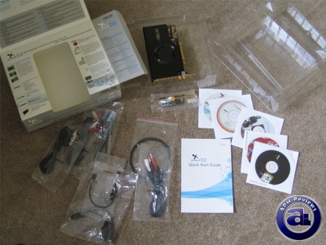 Sliding out the dual section PET shell reveals an absolutely incredible bundle with the Asus Xonar D2 package. Out of the box, you will receive the following hardware: