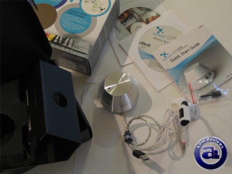 Upon opening the box, you can expect everything inside aligned by classy black cardboard partitions. Out of the box, you will receive a unit of the Asus Xonar U1 itself, a microphone, optical out adapter, quick start guide, and a driver/application/utility disc plus a separate demo disc. Nothing fancy, nothing extra -- just the bare necessities -- which isn't necessarily a bad thing.