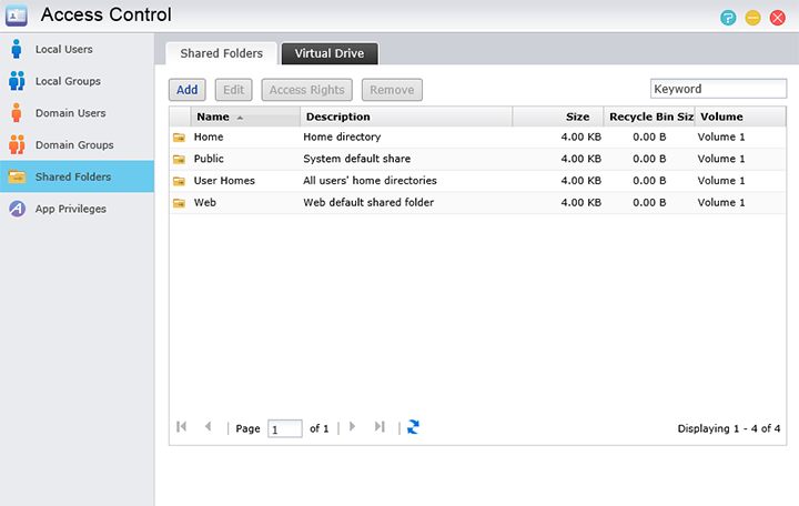 When it comes to permission settings, the Access Control application is what you would want to open up. There are six sections here; starting from top to bottom they are Local Users, Local Groups, Domain Users, Domain Groups, Shared Folders, and App Privileges. Starting with Local Users, we are shown a list of users that are currently created and allowed to create, edit, or remove users. Local Groups is used to create permission settings for different groups of users. Domain Users and Domain Groups is used to do the same thing, but for online AD users and groups. The Shared Folders tab is probably one of the most important ones here, as it is used to set the directories that each account is allowed to use, and where these folders point to specifically on the storage devices. App Privileges is used to determine what user can use which type of application as multiple accounts may be made to access the NAS and the corresponding applications. We will go more in-depth about these applications further on in our review.