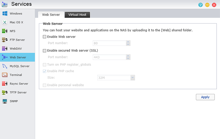 The next feature we will be taking a look at will the found in the Services application. Another important aspect of using a NAS is the ability to start up a web server or some form of networked server to not only share files locally within the network, but also over the internet as well. There are a bunch of settings and options here again, starting from top to bottom they are Windows, Mac OS X, NFS, FTP Server, WebDAV, Web Server, MySQL Server, Terminal, Rsync Server, TFTP Server, and SNMP. Windows options will most likely be used if there is at least one Windows devices on the network; being able to add the NAS to a domain and activating Active Directory is a great feature on any NAS.