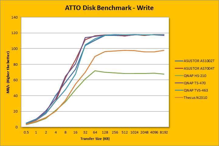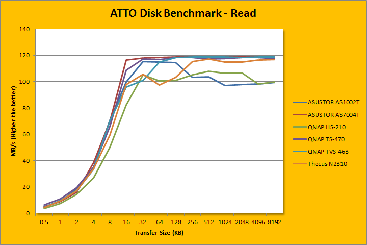 ATTO disk benchmark provides valuable insight into evaluating disk performance; it is especially valuable since it is not local disk limited like Windows file copy -- but rather the network adapter itself. After first using it in our QNAP TS-559 Pro+ review four years ago, ATTO has been an integral part of our storage benchmarks; used in everything ranging from USB flash drives to solid state disks. Venturing in the area of 117.734MB/s in read and 115.395MB/s write for 64K and up, remember that the theoretical maximum of Gigabit Ethernet is 'only' 125MB/s (1000Mbps / 8) with overhead -- this again is excellent. The read and write ramp up is fairly similar, as you can see in our charts above. Unfortunately, the read performance drops off a bit after 256K, which I find kind of odd. I repeated the test a few more times with identical results. Either way, for the price, you are getting pretty awesome throughput, at least in light workloads.