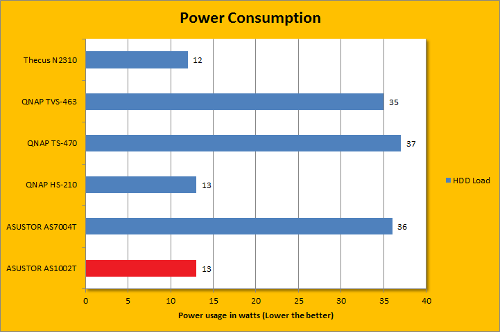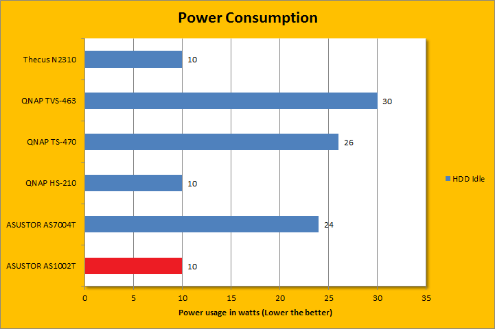With one Seagate NAS hard drive installed, power consumption for our specific configuration is at an excellent 10W idling and 13W under load. It was almost the same as the Thecus N2310 and QNAP HS-210, but the ASUSTOR AS1002T delivered significantly better performance in our tests. Power consumption will drop even further if the hard drives are configured to turn off if they are not used. Considering it is going to be running 24/7, every watt will definitely add up.