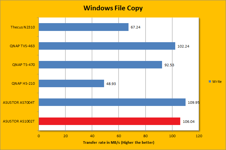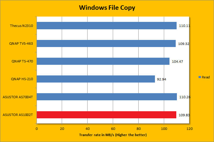 Equipped with the Seagate NAS HDD ST4000VN000 4TB, our ASUSTOR AS1002T was ready to roll. From our experience in benchmarking, Intel Gigabit LAN adapters -- at least on the client side -- typically perform better than their Realtek and Marvell counterparts. Therefore, to prevent any bottlenecks on the client side, our Gigabyte GA-Z97X-UD3H-BK motherboard was connected to the network via its integrated Intel Gigabit LAN adapter. We also conducted the tests on our OCZ Vector 180 240GB solid state drive on the client side to ensure there is nothing limiting the performance of our ASUSTOR AS1002T than the NAS itself. In turn, the results were downright impressive, especially for a low power NAS. As you can see in our graphs above, the ASUSTOR AS1002T was capable of doing approximately 110MB/s for read and 106MB/s for write using the Seagate NAS HDD. In fact, it was pretty close to the high end ASUSTOR AS7004T, which is probably the best performing network attached storage systems here at APH Networks. Of course, this is not representative of heavy multi-user workloads, which the Intel Core i3 based AS7004T will definitely pull ahead in resource intensive applications. Otherwise at this point, the bandwidth of Gigabit LAN starts to become a limitation.