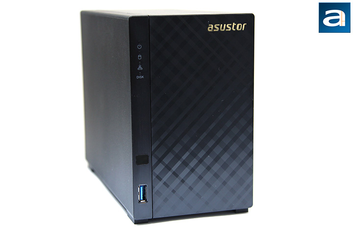 ASUSTOR's logo is finished in brushed silver-colored finish recessed into the diamond plate cover, and placed near the top right corner; whereas a black, brushed hard plastic surface occupies a slim vertical portion on the left. An array of four LEDs are located in this area. Starting from the top, the first one glows steady green when the NAS is turned on, and flashes every ten seconds in night mode. Next up is a system status indicator LED. When booting, it will flash green, and turn steady when your NAS is ready. If there is a system, hard disk, fan, or system temperature abnormality, it will turn red. Moving below is a network LED, which will light steady green when the network port is connected. Lastly, a green hard disk activity LED will glow steady when the hard drive is idling, and flash when data access is in progress. Near the bottom, you will find what appears to be an IR receiver above the front USB 3.0 port. The IR receiver is actually functional in this model, and is used for the remote, which we will look at in just a moment.